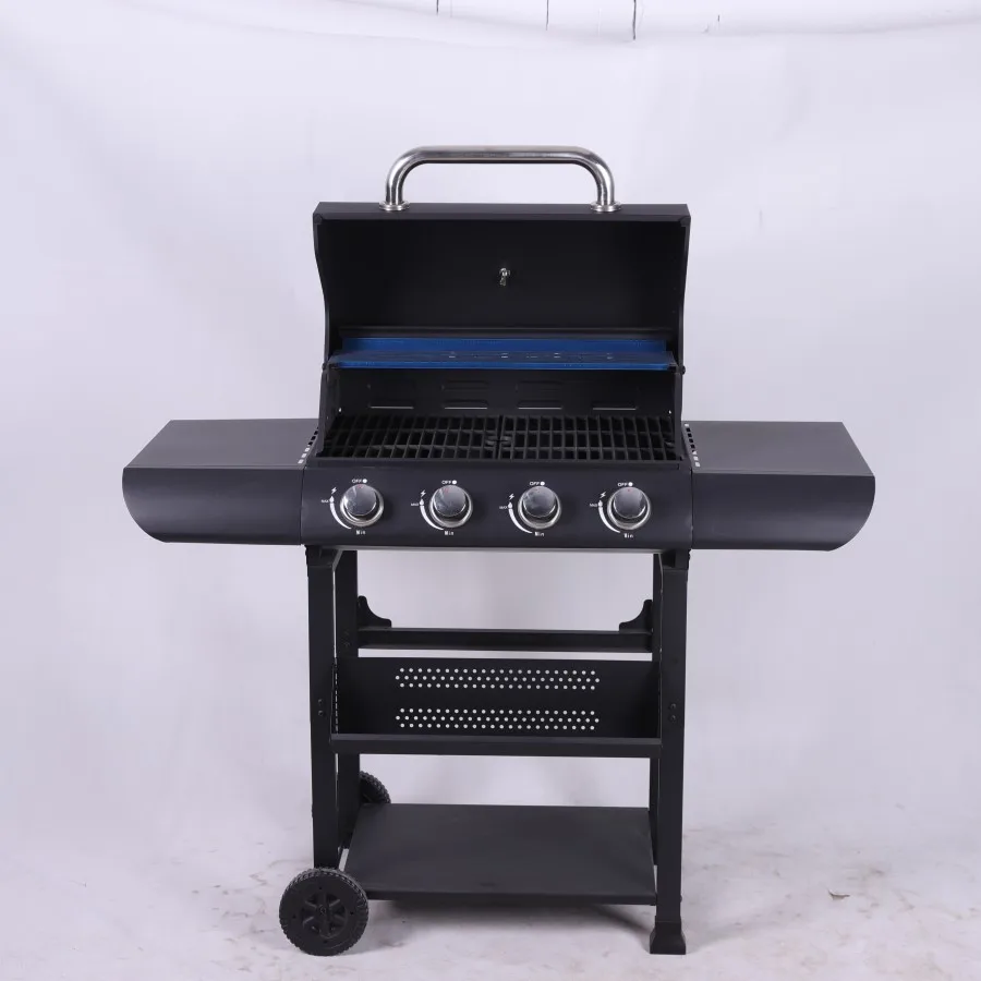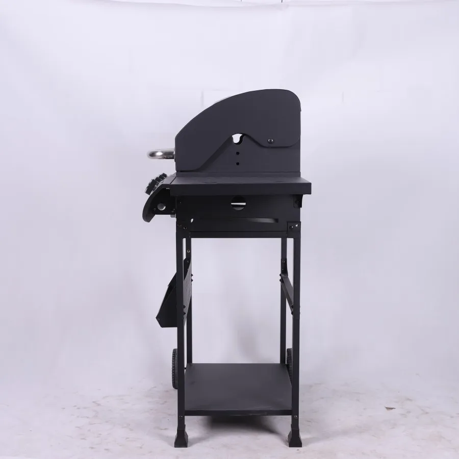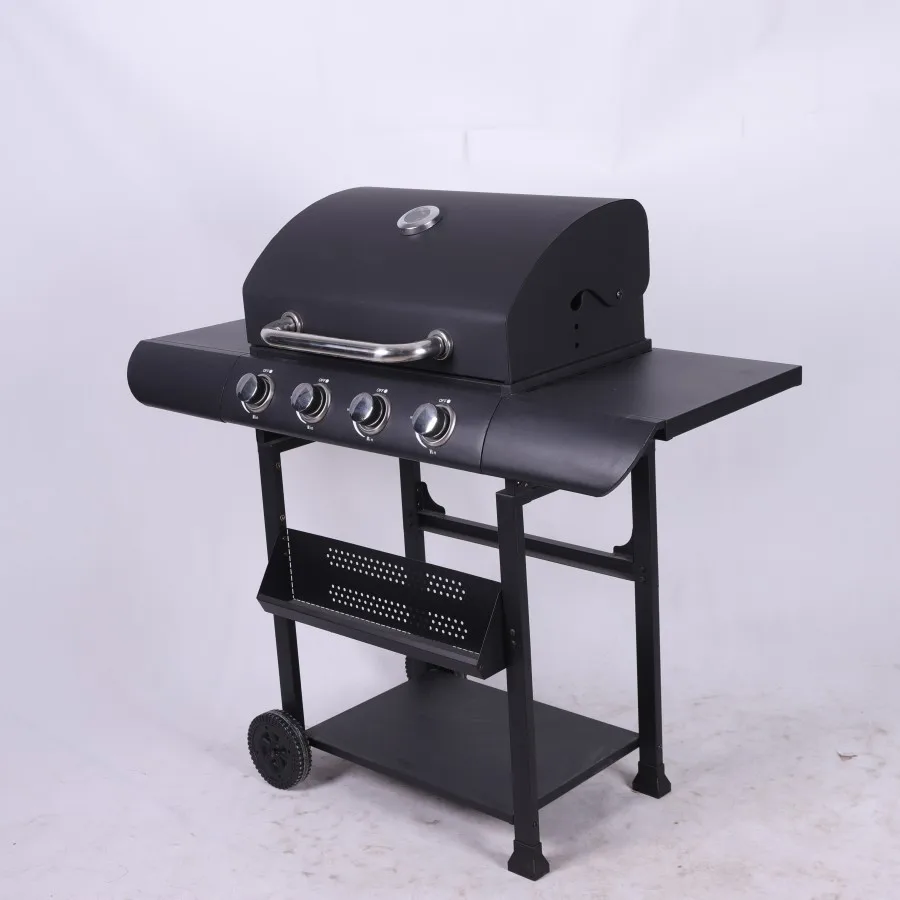 Experience the ultimate outdoor cooking with this premium 4-burner propane gas grill, thoughtfully designed for both convenience and performance. The sleek cabinet-style base provides ample storage space for your grilling essentials while the trolley design ensures easy mobility around your patio or garden. Featuring advanced smokeless technology, this grill lets you enjoy hassle-free barbecuing without excessive smoke, making it perfect for any outdoor setting. The four powerful burners offer precise temperature control and even heat distribution across the generous cooking surface. Built with durability in mind, this grill combines sturdy construction with elegant styling, including a barrel-shaped lid that helps maintain consistent cooking temperatures. Whether you're hosting a family gathering or weekend barbecue, this versatile grill delivers restaurant-quality results while enhancing your outdoor living space.