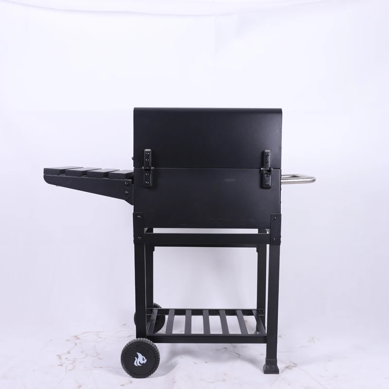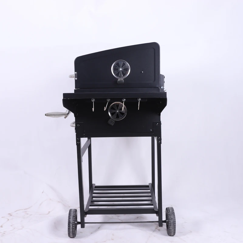 Experience the perfect blend of convenience and classic charcoal grilling with this premium outdoor BBQ grill smoker. Featuring a sturdy trolley cart design, this portable grill lets you easily move your cooking station wherever the party takes you. The spacious cooking surface provides ample room for searing steaks, grilling vegetables, or smoking your favorite meats to perfection. Built with high-quality materials and a durable black finish, this charcoal grill includes adjustable air vents for precise temperature control and a convenient ash collection system for easy cleanup. The integrated side shelves offer extra prep space, while the lower storage rack keeps your grilling essentials within reach. Whether you're hosting backyard barbecues or enjoying weekend cookouts, this versatile charcoal grill delivers authentic smoky flavors and reliable performance for all your outdoor cooking adventures.