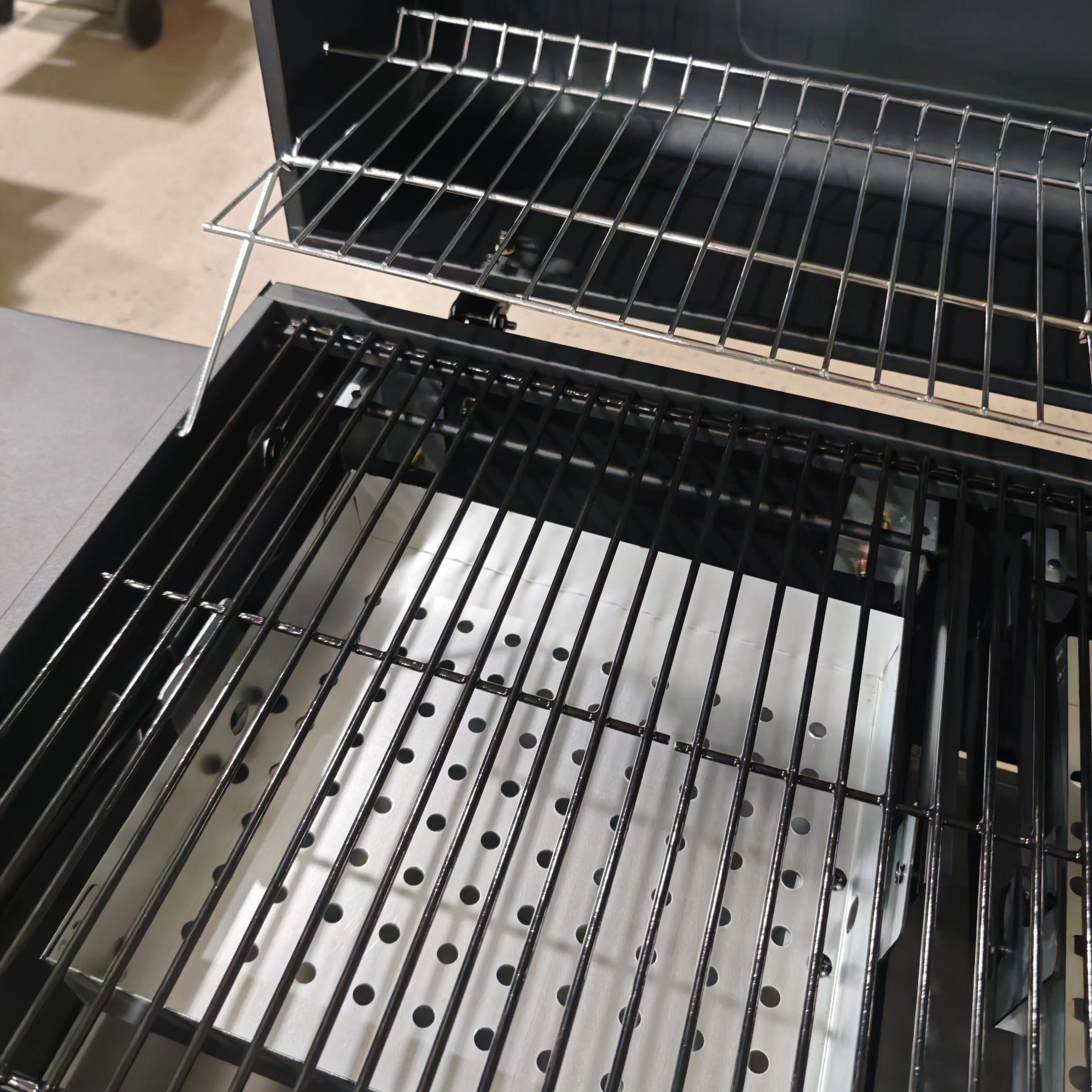 The adjustable height mechanism provides exceptional cooking control by allowing users to modify the distance between the cooking surface and heat source. This feature enables precise temperature management across different cooking zones, ensuring optimal results for various food types and cooking techniques. The integrated chimney system promotes efficient airflow and smoke circulation throughout the cooking chambers, while the built-in thermometer delivers accurate temperature monitoring for consistent cooking performance.